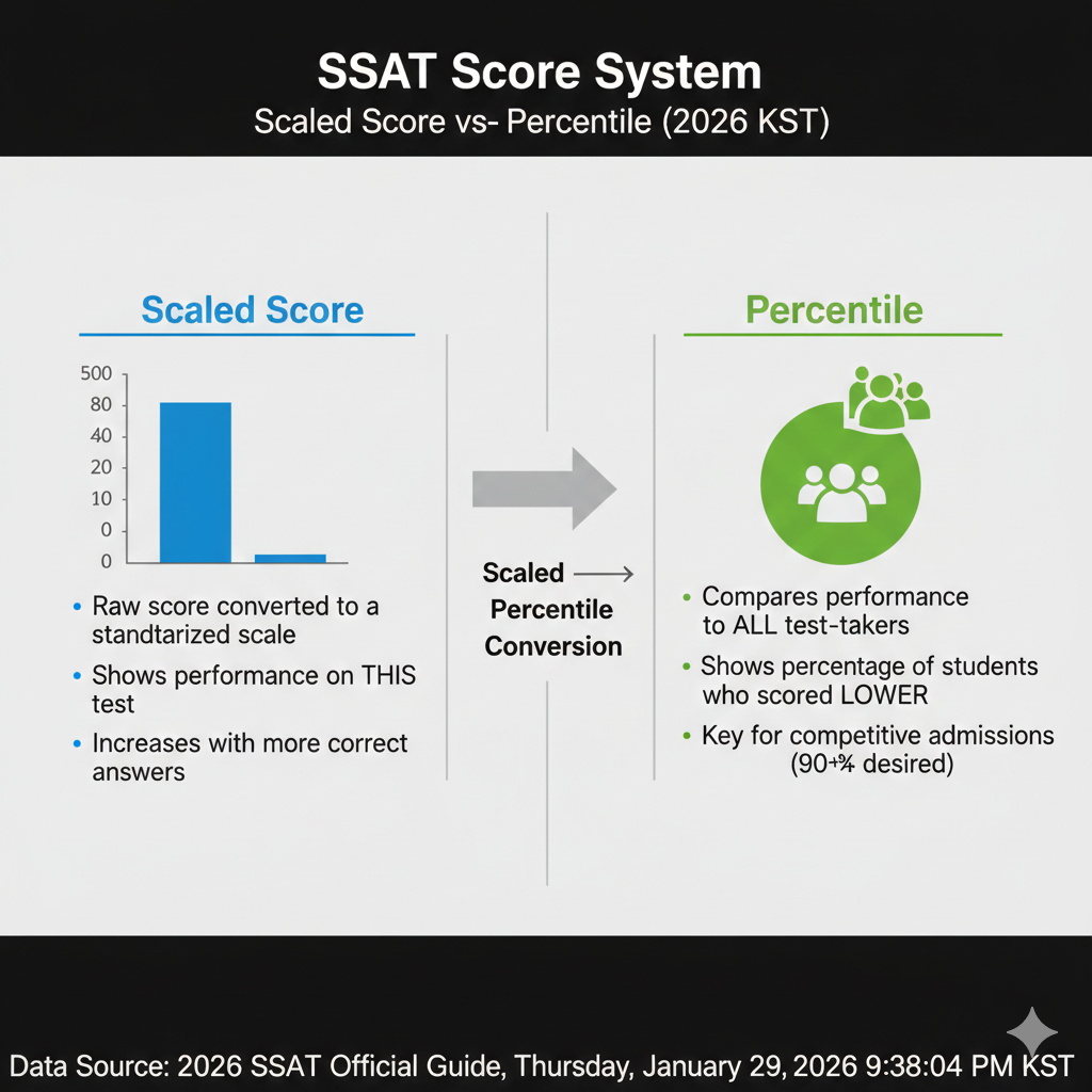 미국 내 사립학교 입학 시험인 SSAT는 학생의 지적 잠재력을 측정합니다. 특히 국제 학생에게는 미국 학생들과 경쟁했을 때의 상대적 위치를 나타내는 Percentile(백분위) 점수가 매우 중요하게 작용합니다.