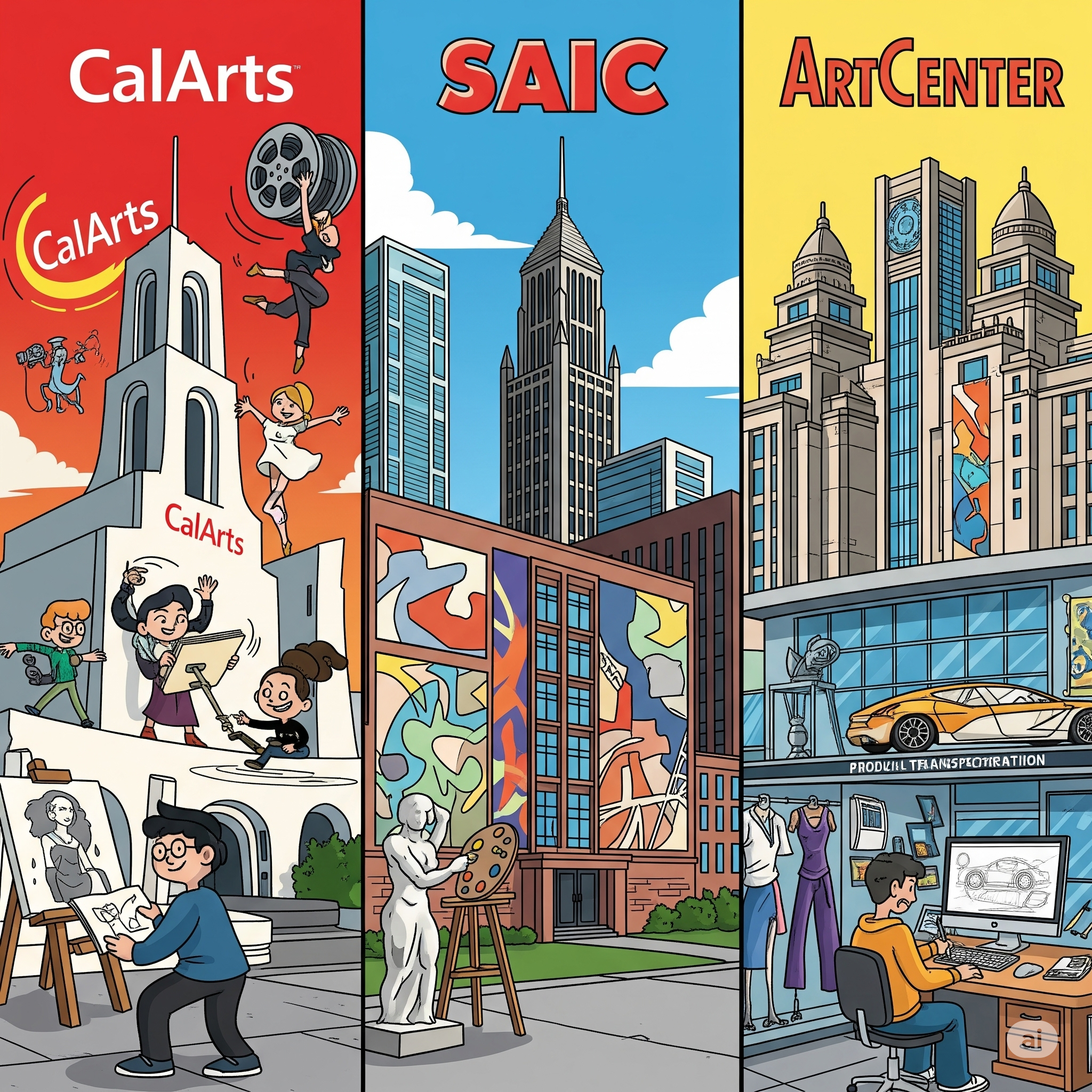 미국 서부와 중부에는 창의성과 실험정신을 강조하는 미국 예술대학들이 자리하고 있습니다. 대표적으로 캘리포니아예술대학(CalArts), 시카고예술학교(SAIC), 아트센터 칼리지 오브 디자인(ArtCenter)이 있습니다.