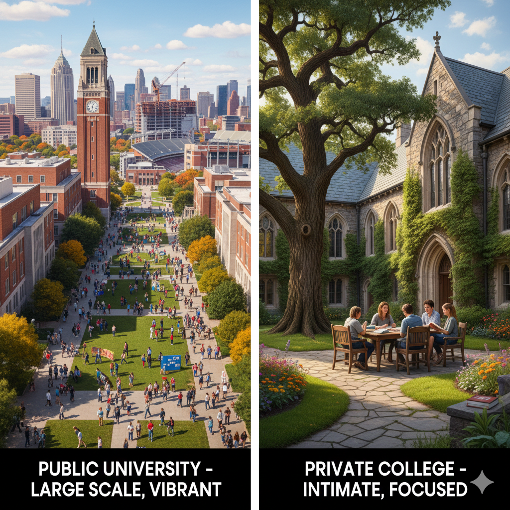 미국 대학 입시를 준비할 때, 주립 대학(Public University)과 사립 대학(Private University) 중 어느 유형을 선택할지는 단순한 선호도를 넘어 재정적 지속 가능성과 개인의 학업 성공에 결정적인 영향을 미칩니다. 이 두 유형의 기관은 자금 출처(정부 vs. 기부금/학비)가 다르기 때문에, 학생들에게 제공하는 학비, 규모, 교육 시스템, 그리고 장학금 기회에서 확연한 차이를 보입니다.