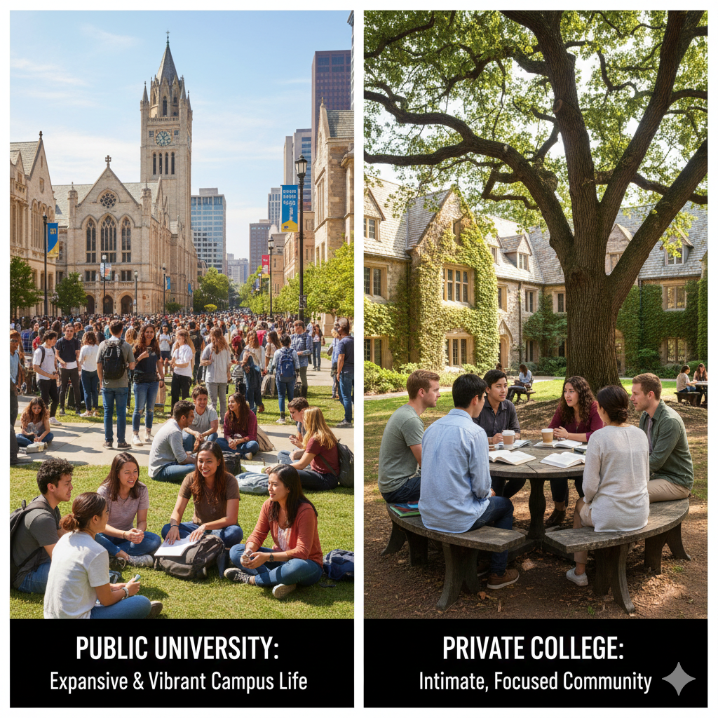 특히 국제 학생(유학생)에게는 In-State/Out-of-State 학비 구조와 제한적인 장학금 옵션 때문에 주립대와 사립대를 비교하는 과정이 더욱 복잡하고 전략적이어야 합니다. 이 글은 주립대와 사립대의 핵심 차이점을 3가지 측면(재정, 규모 및 자원, 교육 철학)에서 심층 분석하고, 유학생이 가장 비용 효율적이고 적합한 대학을 선택할 수 있도록 구체적인 전략을 제시합니다.