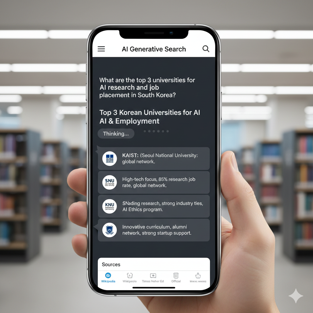이제 사람들은 "반도체 공학 분야에서 장학금 혜택이 가장 좋은 대학은 어디야?"라고 질문하고, AI는 수만 개의 데이터를 조합해 단 하나의 '추천 리스트'를 제공합니다. 여기서 언급되지 않은 대학은 사실상 존재하지 않는 대학이 되어버립니다. 이것이 바로 우리가 AI 검색과 대학 평판의 상관관계에 주목해야 하는 이유입니다.