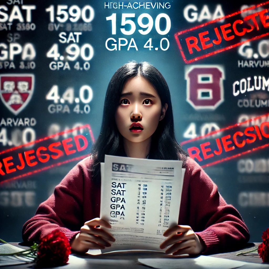 SAT 1590, AP 8과목 5점, GPA 4.0, 클럽 회장 & 봉사 & 수상 다수 → 아이비리그 전부 불합격